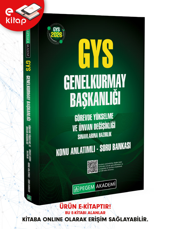 PEGEM Akademi Görevde Yükselme Sınavlarına Hazırlık Yayınlarımız, alanında uzman yazar komisyonumuz tarafından, en son yayımlanan sınav ilanındaki konular kapsamında hazırlanmıştır. Kitaplarımız, yayımlandığı tarihe kadar mevcut olan tüm güncellemeleri kapsamaktadır. Kitaplarımız yayımlandığı tarihten sonra, yayımlanan sınav ilanlarına eklenen ya da çıkarılan konular ve mevzuat güncellemeleri, okuyucularımızın sorumluluğu dâhilindedir. Sınava girecek olan adaylarımız, yayınımızda bulunan mevzuat konularında yer alan Ek Form veya Örnek Formlara (http://www.mevzuat.gov.tr) internet adresinden ulaşabilirler. Genelkurmay Başkanlığı Görevde Yükselme ve Ünvan Değişikliği Sınavlarına Hazırlık Konu Anlatımlı Soru Bankası yayınımız, sizlere güncel bir yayın iletme gayesi ile özenle hazırlanmıştır. Konularda teorik çerçeve net bir şekilde çizilmiş ve konu sonlarında çözümlü testler ya da cevaplı tarama testlerine yer verilmiştir.