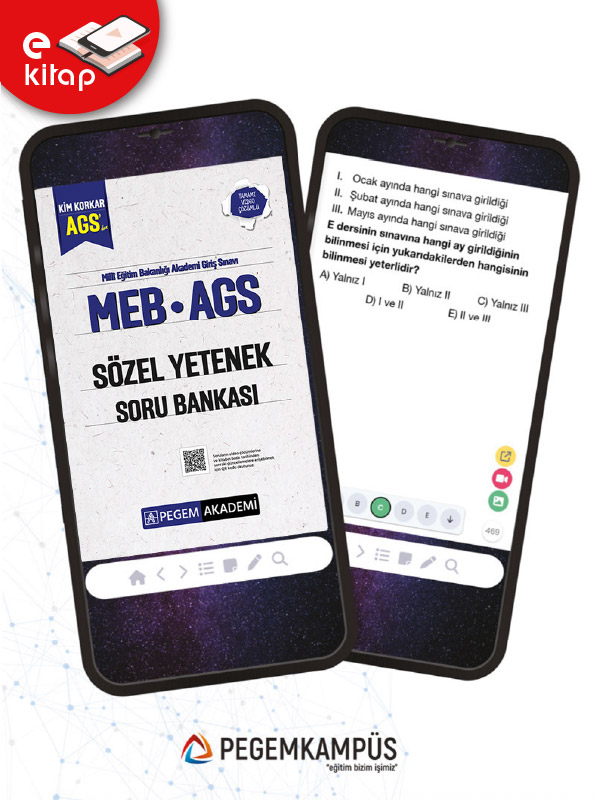 Milli Eğitim Bakanlığı Akademi Giriş Sınavı (MEB-AGS), geleceğin öğretmenlerinin belirlenmesinde son aşamadır ve öğrenim hayatınız boyunca verdiğiniz emeğin sonucu meslek hayatınıza adım atmanızla nihai başarıya dönüşecektir. Bu süreçteki emek ve çabanız, programlı bir çalışma ile sizi hedefinize doğru yöneltecek ve öne geçirecektir. Böylesi bir süreçte programlı bir çalışmaya kaynaklık edecek olan, deneyimli bir yazar ekibi tarafından özenle oluşturulmuş, geniş kapsamlı yayınlar olacaktır. Pegem Akademi yazar ekibinin öncelikli amacı, tam da bu kaynağı sizlere sunmak olmuş ve sonucunda sizleri başarıda öne taşıyacak bu kapsamlı MEB-AGS Tamamı Çözümlü Sözel Yetenek Soru Bankası kitabı ortaya